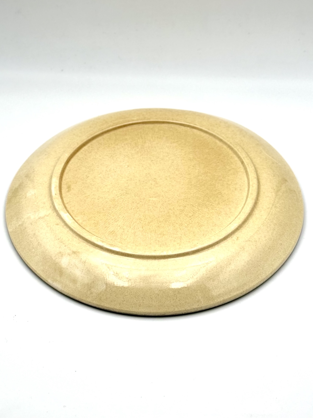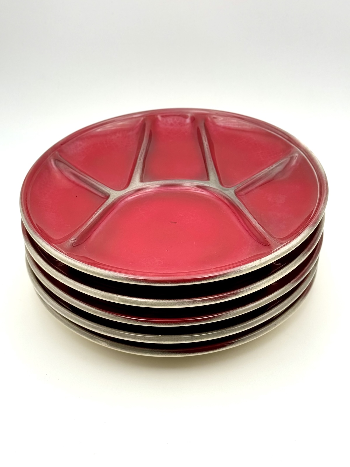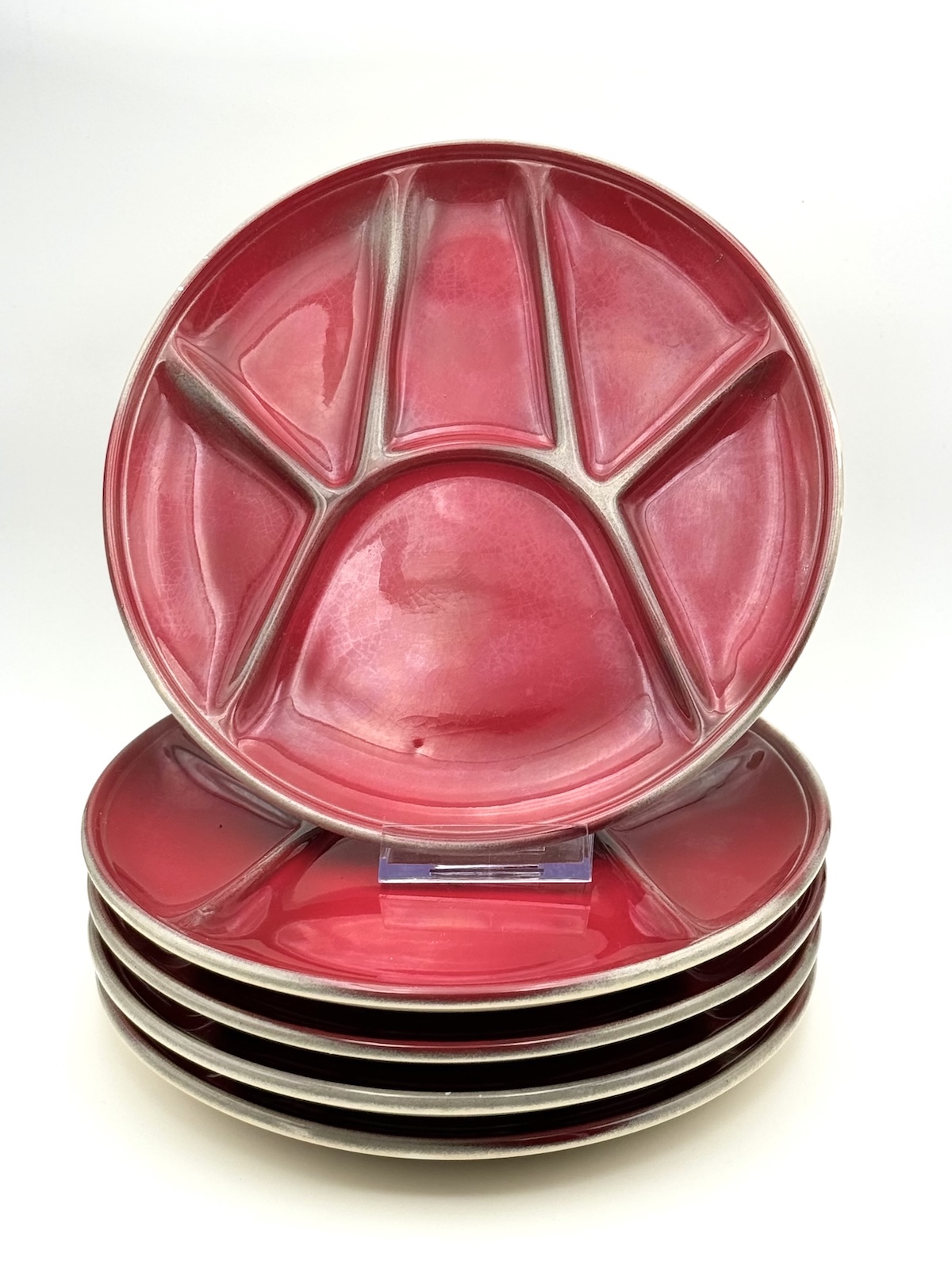 Cinq assiettes à fondue en Faïence émaillée rouge.