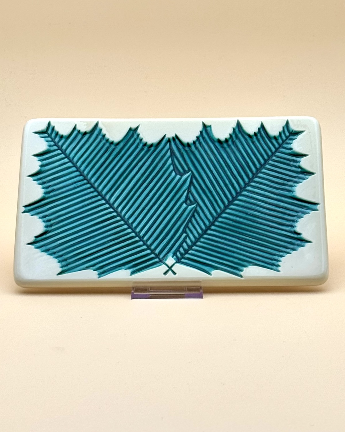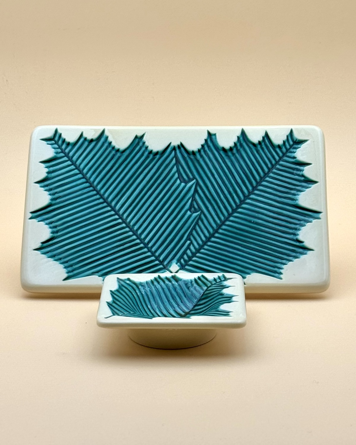 Décor de feuilles vertes en emprunte sur fond blanc.